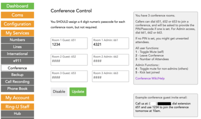 To use the ring-u Conference Center feature, enable it on your customer portal under My Services > Conference for $9.95 per month. You can cancel at any time. Keep in mind that internal extensions, including softphones on your system but outside of your office, do not count as users/lines. Only users dialing in from outside via your phone number count.
