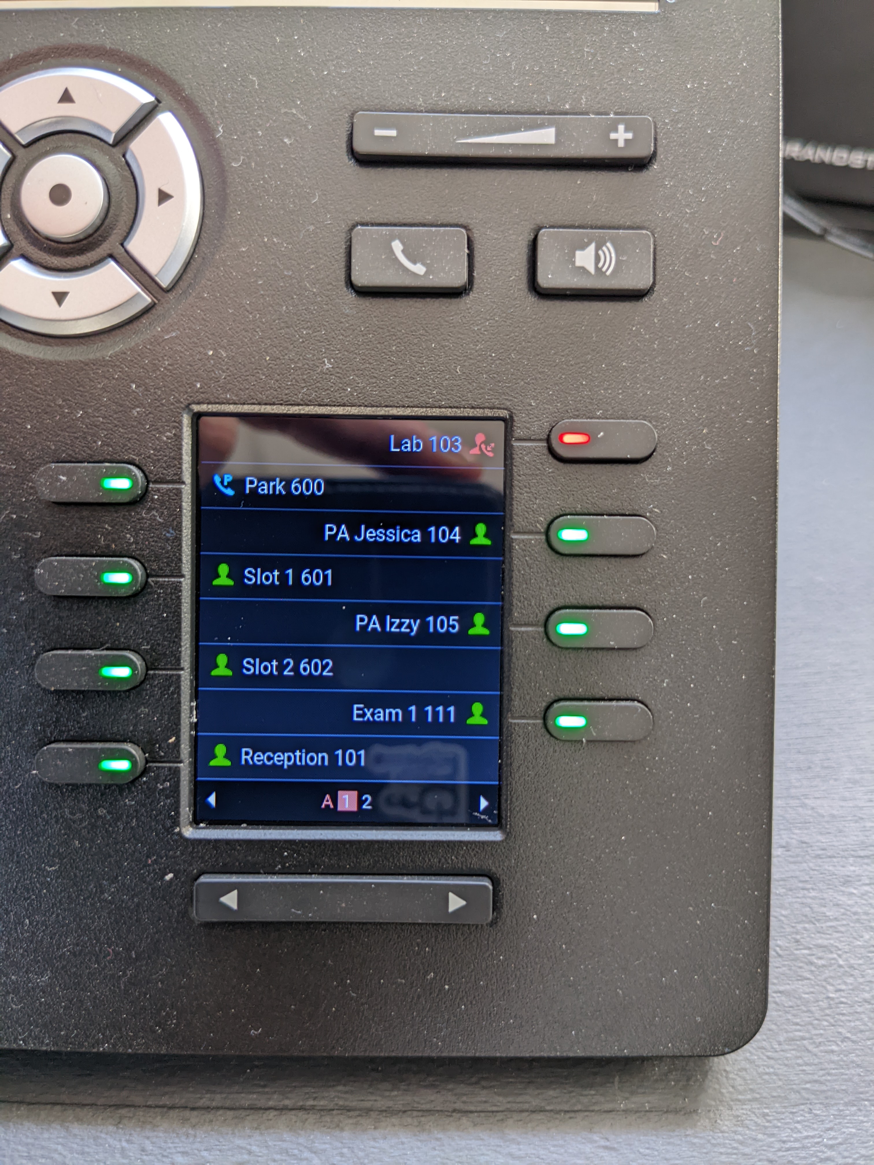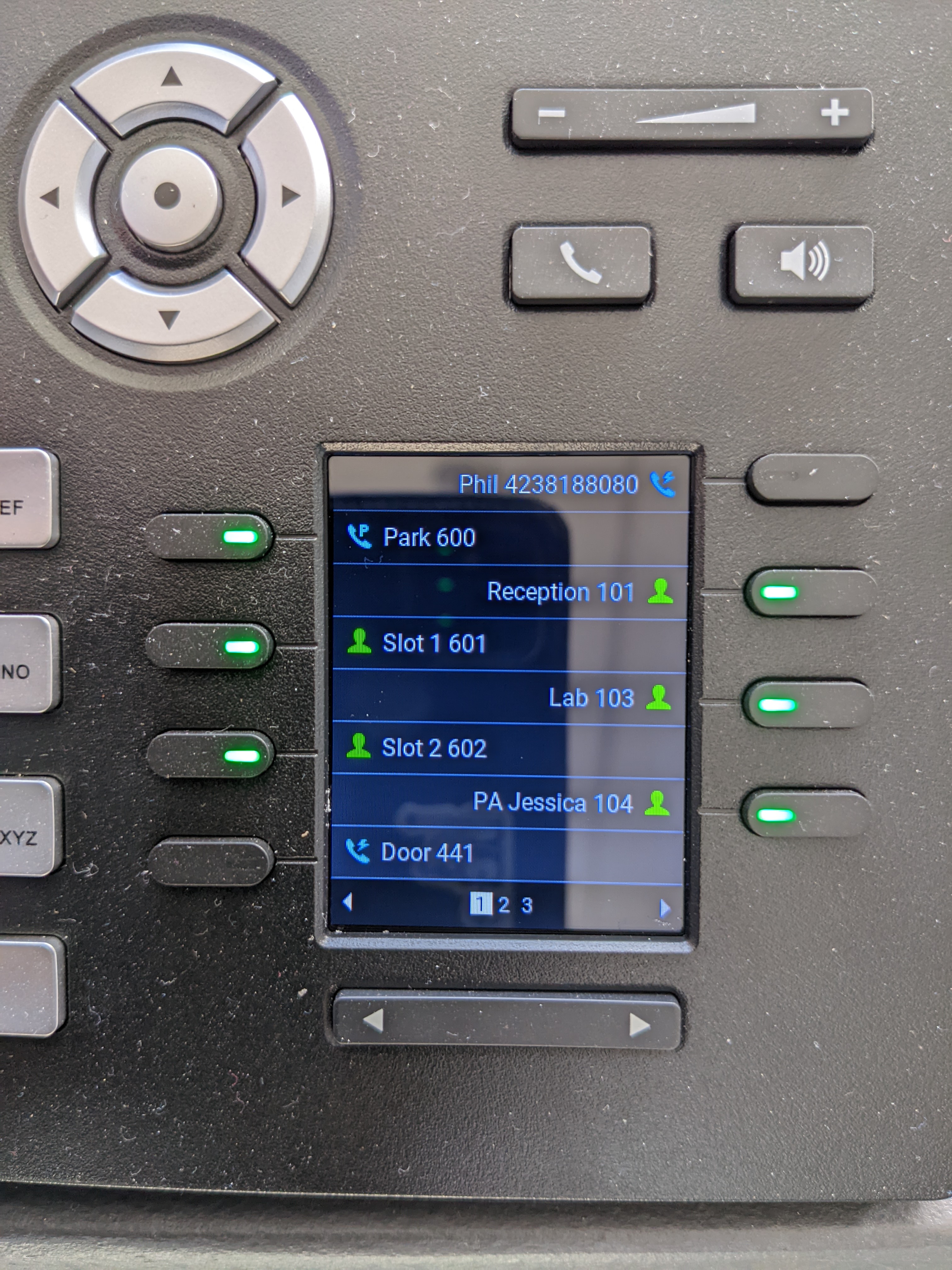 Following the standard Park/Parking Slot BLF's, the display will list your other extensions, as well as their status (Green for available, Red for in use). In the photo above, the Lab extension is red because it is currently in use.