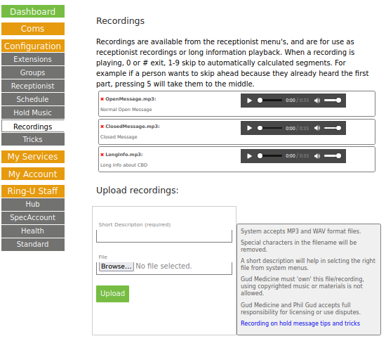 If you have created audio files that you want to save and use over and over again, use the Recordings menu to upload them. These can be selected from the Receptionists configuration as the message that plays, or longer informational recordings. Use these for: